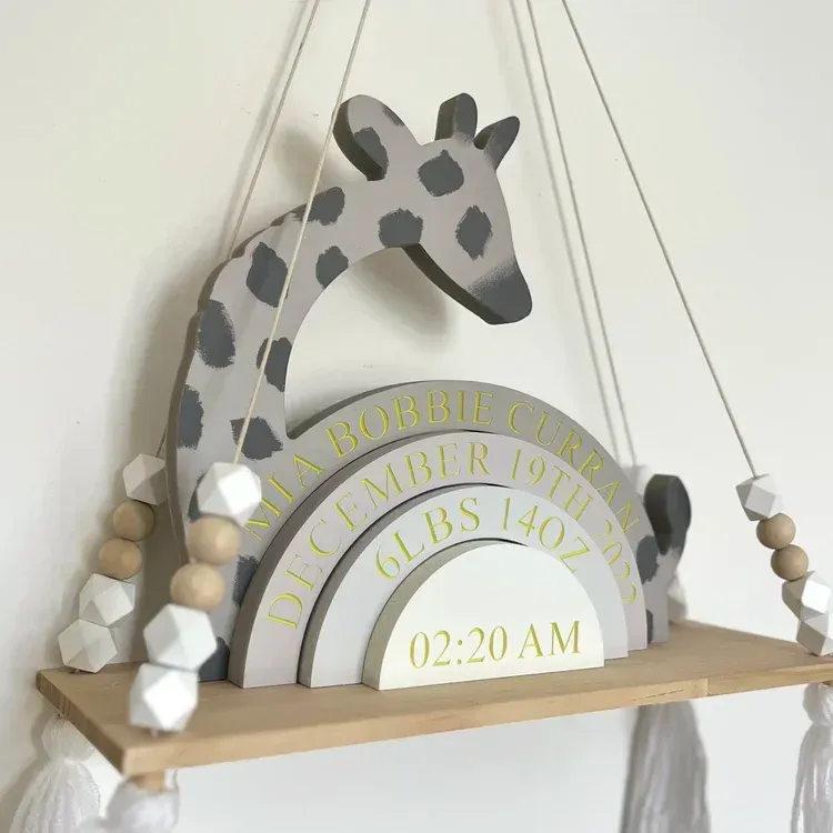 This personalized Giraffe Stacking Toy is a unique keepsake designed to celebrate the birth of your baby. Customizable with your baby’s name, birthdate, birth time, and weight, it serves as a memorable and meaningful piece to commemorate the special day. Crafted from high-quality wood, this toy is a beautiful and timeless addition to your baby's nursery.
