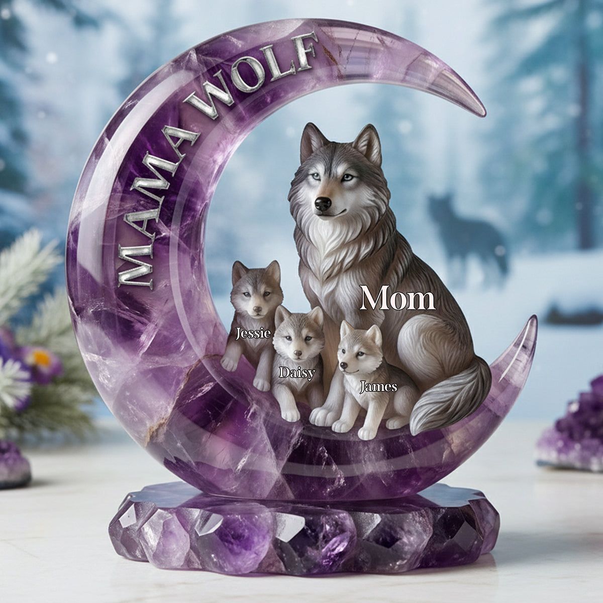 Fully Personalized Customization: Personalize with the mother’s name (e.g., Mom), the names of all her children (e.g., Jessie, Daisy, James), and a family motto (e.g., MAMA WOLF), creating a one-of-a-kind “wolf pack” keepsake exclusively for your family.